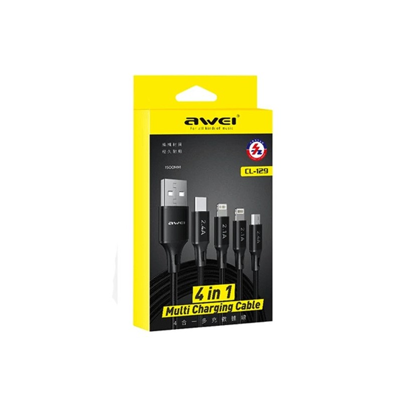 AWEI CL-129 Καλώδιο Φόρτισης και Μεταφοράς Δεδομένων 1.5Μ DATA CABLE 4 Σε 1 Multi Charging Cable USB σε Lightning / Type C / mic